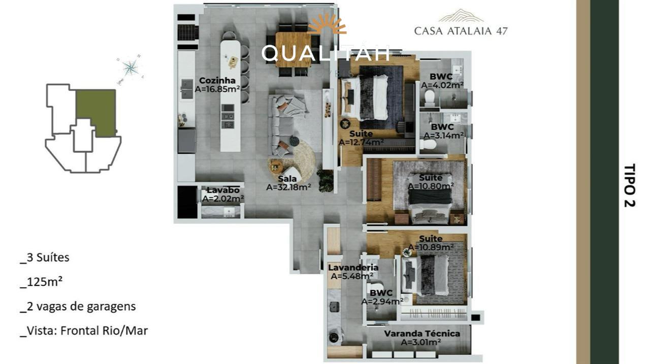 CASA ATALAIA 47 Rua Antônio Rocha de Andrade esquina Rua Santa Beatriz - Itajaí -SC -27 andares -Apartamentos de 86 a 262 m² -Arquitetura Autoral -Vista Permanente -Tipos de apartamentos TIPO 1 - Duplex: 172,85m² a 177,06 m² TIPO 2 - 3 Suítes 125 m² TIPO 3A - 2 Suítes 92m² TIPO 3B - 2 Suítes 86m² TIPO 4 - 2 Suítes 87,07m2 COBERTURA: 4 Suítes - 262,64 m² -Lazer completo: Piscina com vista para o rio e o mar Lounge e espaço gourmet Salão de festas Bar e jogos Praça do fogo Academia e espaço yoga Redário e horta Quiosques com churrasqueira e grill americano Espaço pet, playground e brinquedoteca Espaço picnic
