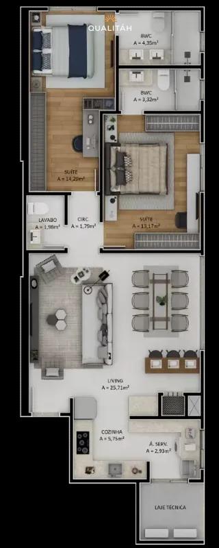 Este apartamento está totalmente mobiliado, sendo que o valor anunciado será vendido com os móveis sob medida. Com 84m² privativos, ele conta com 2 suítes, lavabo, ampla sala de estar e jantar integradas à sacada com churrasqueira a carvão, além de área de serviço separada. Os acabamentos são de alto padrão, com piso porcelanato e vinílico, e a ventilação cruzada garante ambientes sempre bem iluminados e arejados. Possui 2 vagas de garagem.