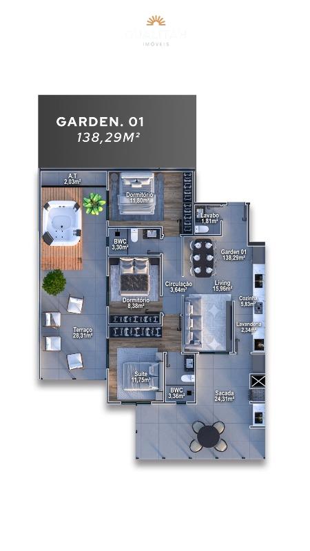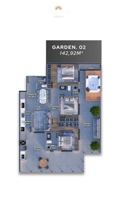 • Coberturas duplex com 3 suítes e amplo terraço, metragens entre 135,55m² e 173,19m² e 2 vagas de garagem